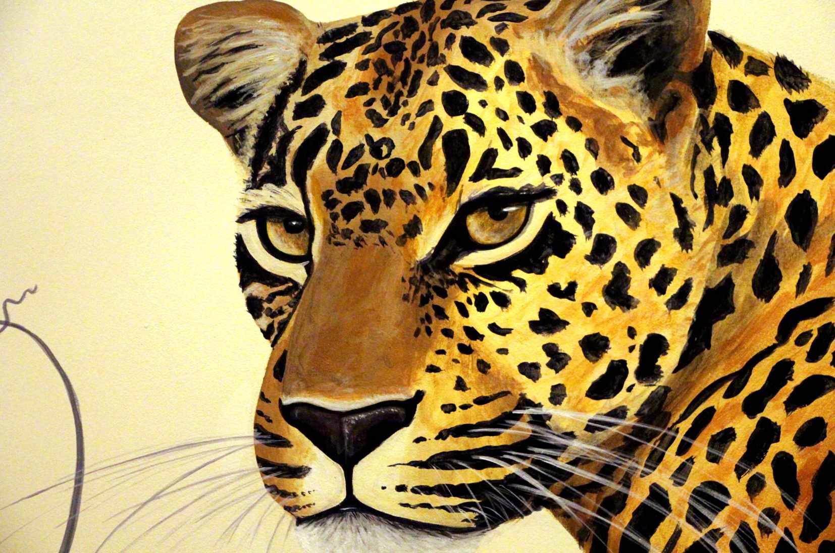 - Panthère tachetée pour une salle de bain. Pensée pendant de long mois, après de nombreuses recherches visuelles pour qu’elle s’insère parfaitement dans son écrin de marbre noir, ce motif est apparu en quelques heures. Dans le cadre carré des maisons modernes, il fallait ajouter de la courbe, de la lumière, de la présence et de l’élégance pour faire oublier les volumes environnants. La panthère nous regarde dans les yeux, elle vous fixe sans agressivité, mais fermement, elle ne vous lâche pas d’un cil. Elle capte votre attention, l’absorbe et en échange vous nourrit de beauté.