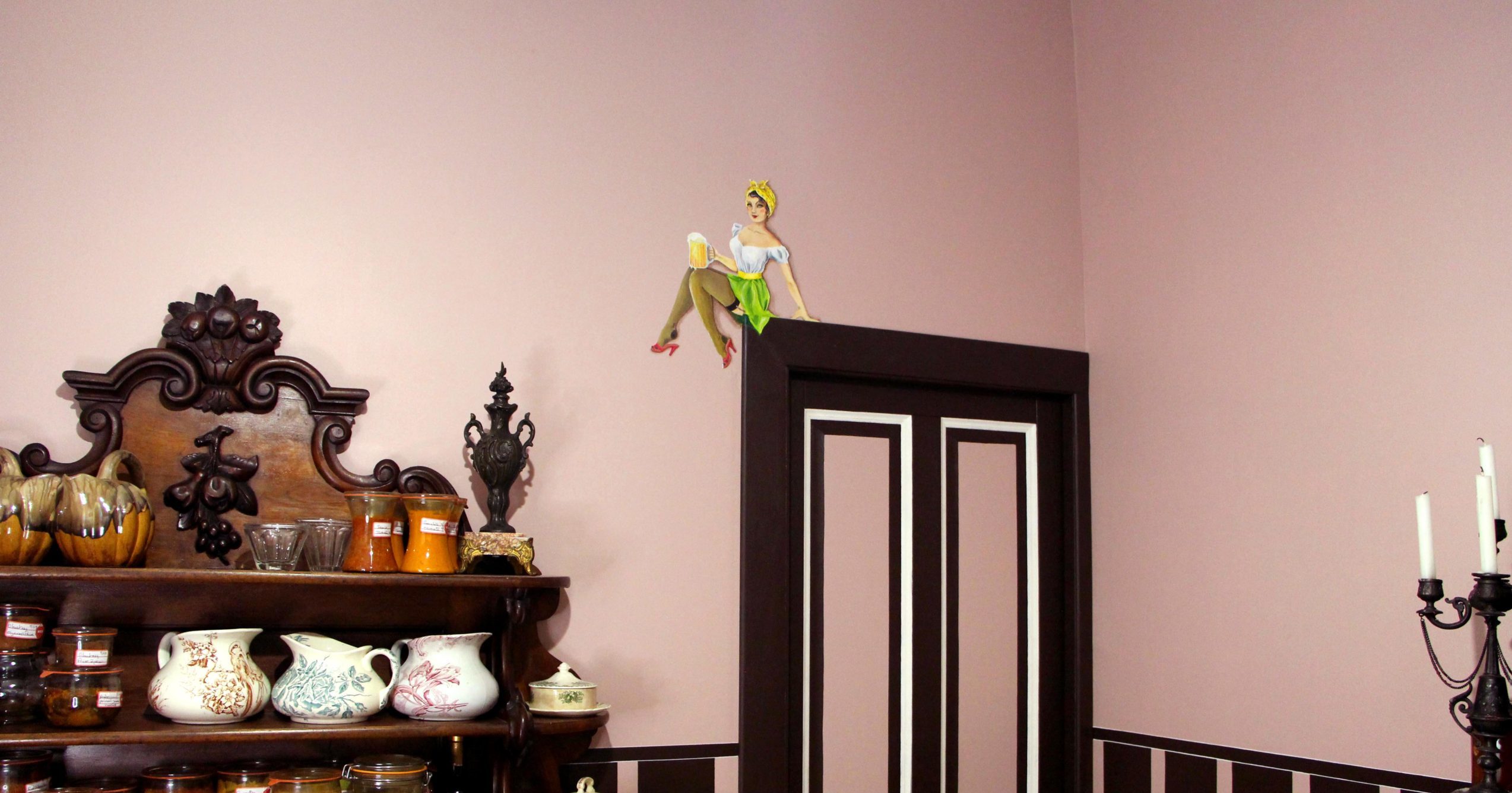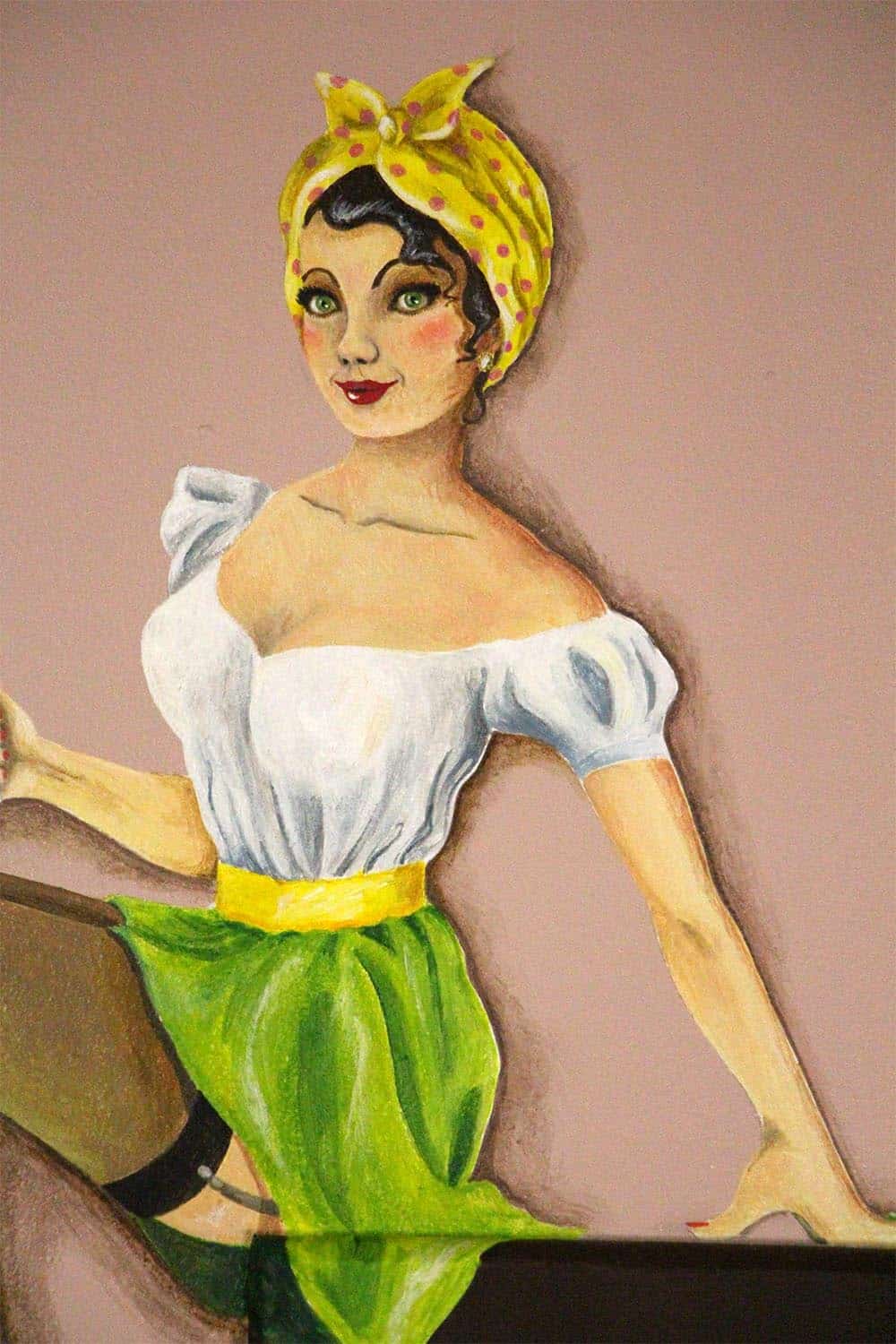 - Réparation, peinture et décoration d’une arrière-cuisine. Blanche au départ, puis peinte en rose avec des rayures marrons. Le tout pour s’accorder aux meubles anciens et rétro dont un magnifique Saint Hubert couvert de conserves. La décoration murale est une pin-up vintage, avec son petit fichu à pois, et une chope de bière. Accueillante, coquette et un peu perchée, elle vous sourit comme pour vous dire : « bon appétit! » Un petit tour d’ombre la fait « sortir » du mur, on aurait envie de vérifier qu’elle n’est pas en 3D.