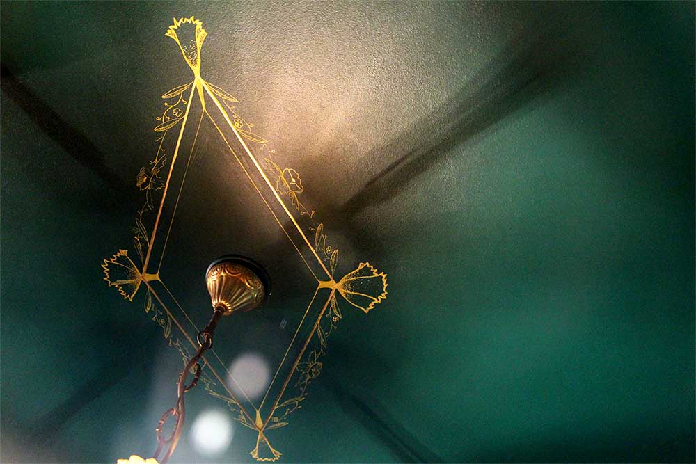 - Grue Royale : Réparation, peinture et décoration d’un passage desservant trois pièces et un couloir. Une salle de transition, de passage où la couleur très osée contient la vue pour lui offrir de brillants détails. Le décor est composé d’une grue royale en pied, rehaussée de peinture dorée et de pigments cuivrés. La rosace au plafond éclaire la pièce, lui donne de la lumière et crée un rappel de couleur essentiel à l’équilibre du tout. Allergiques aux couleurs d’abstenir.